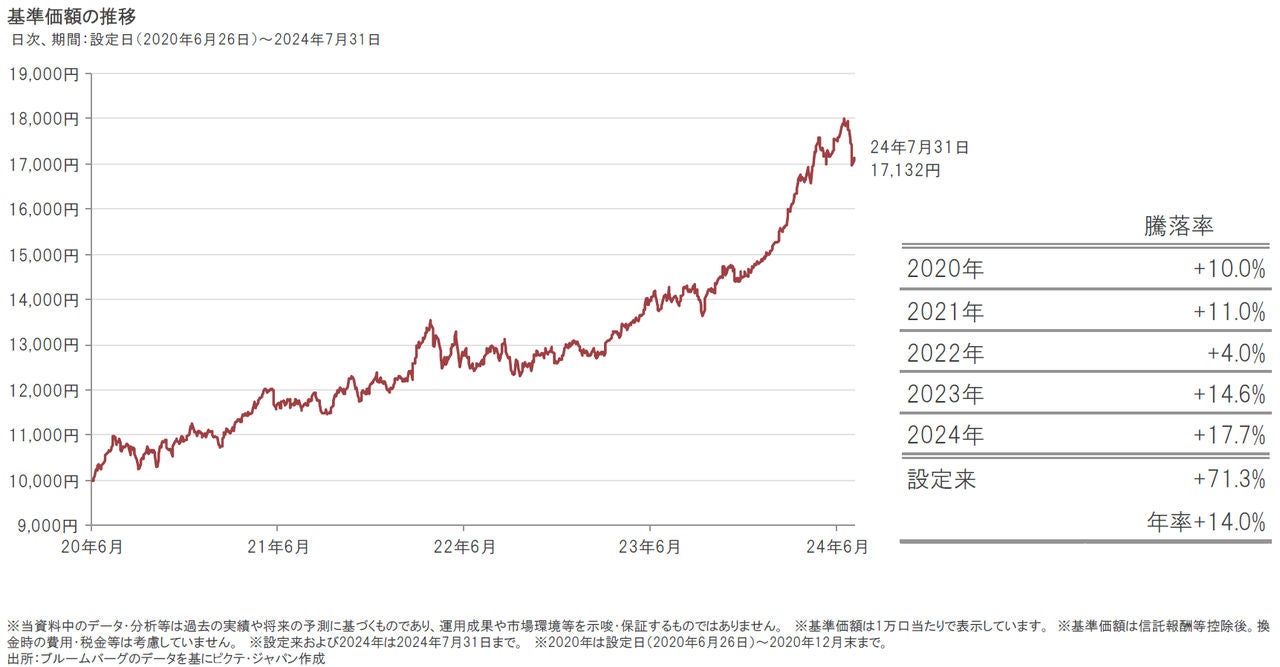 2024年7月31日のポラリスの基準価額は17,132円となり、設定来で+71.3%(年率+14.0%)、年初来で+17.7%上昇しています。