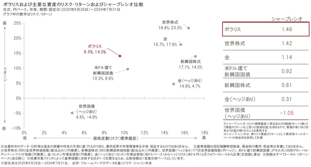 ポラリスの設定来の年率のリスク(標準偏差)とリターンはそれぞれ9.5%、14.0%となっています。