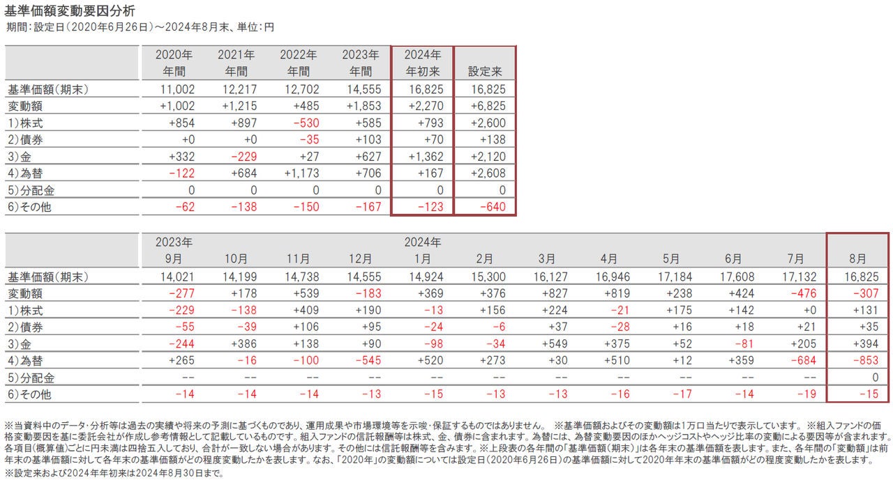 基準価額の変動要因の内訳は、1)~3)市場要因(価格、金利、信用力等の変化による株式、債券、金の変動要因)、4)為替要因、5)分配金要因、および、6)その他です。