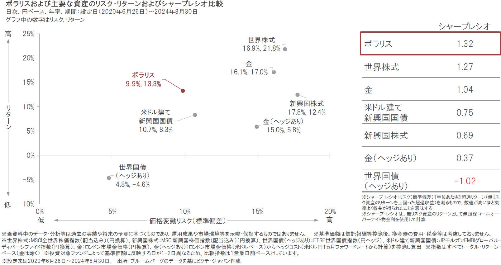 ポラリスの設定来の年率のリスク(標準偏差)とリターンはそれぞれ9.9%、13.3%となっています。
