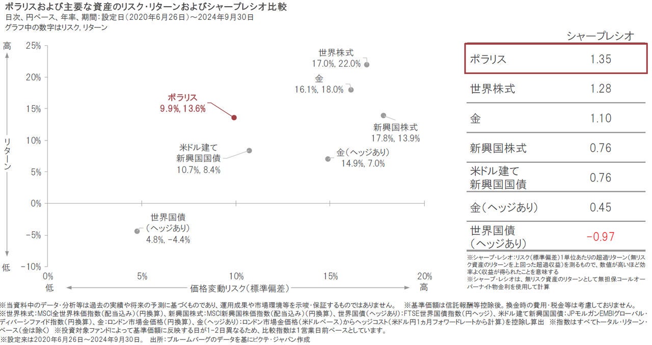 ポラリスの設定来の年率のリスク(標準偏差)とリターンはそれぞれ9.9%、13.6%となっています。