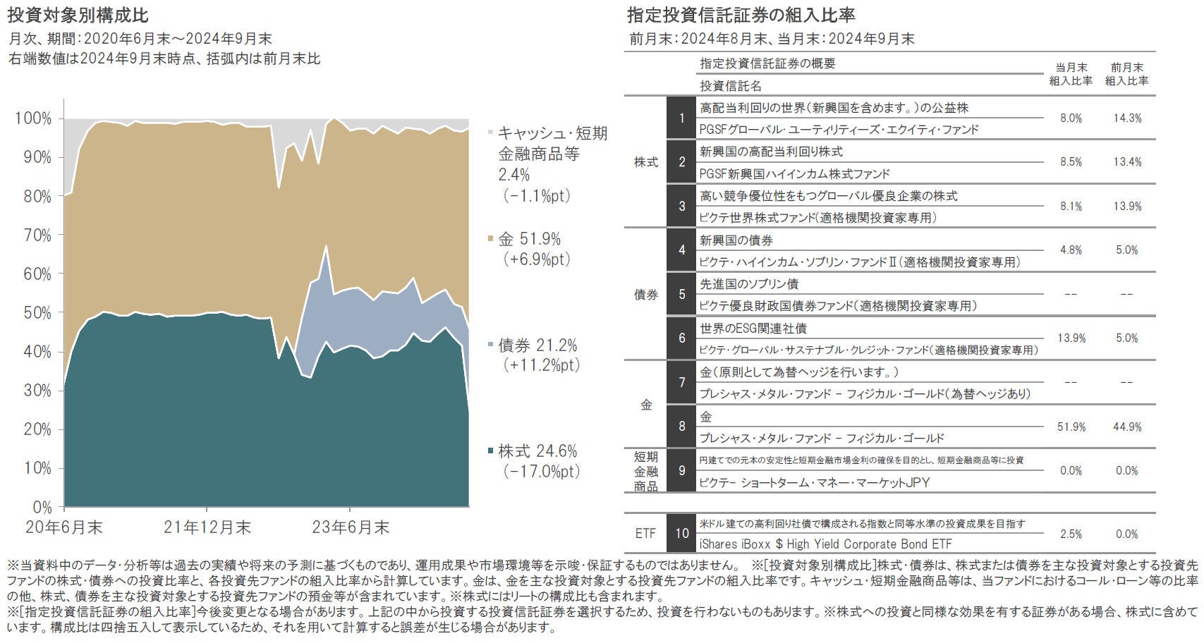 2024年9月末の組入比率は、前月末に対して、債券、金を引き上げた一方、株式、キャッシュ等を引き下げました。