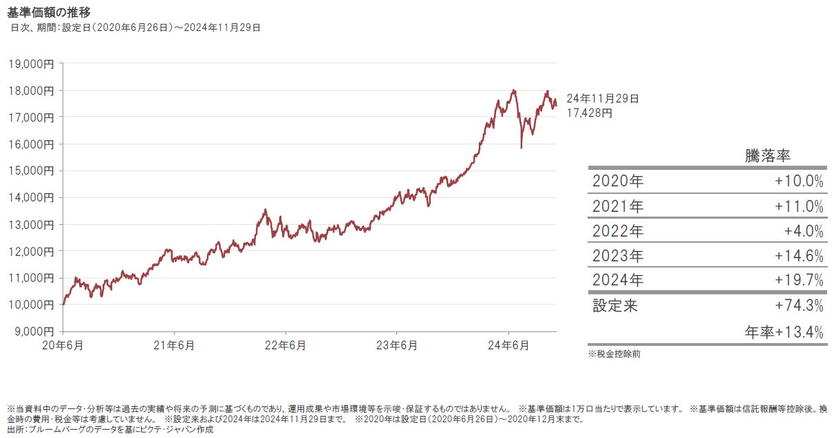 2024年11月29日のポラリスの基準価額は17,428円となり、設定来で+74.3%(年率+13.4%)、年初来で+19.7%上昇しています。