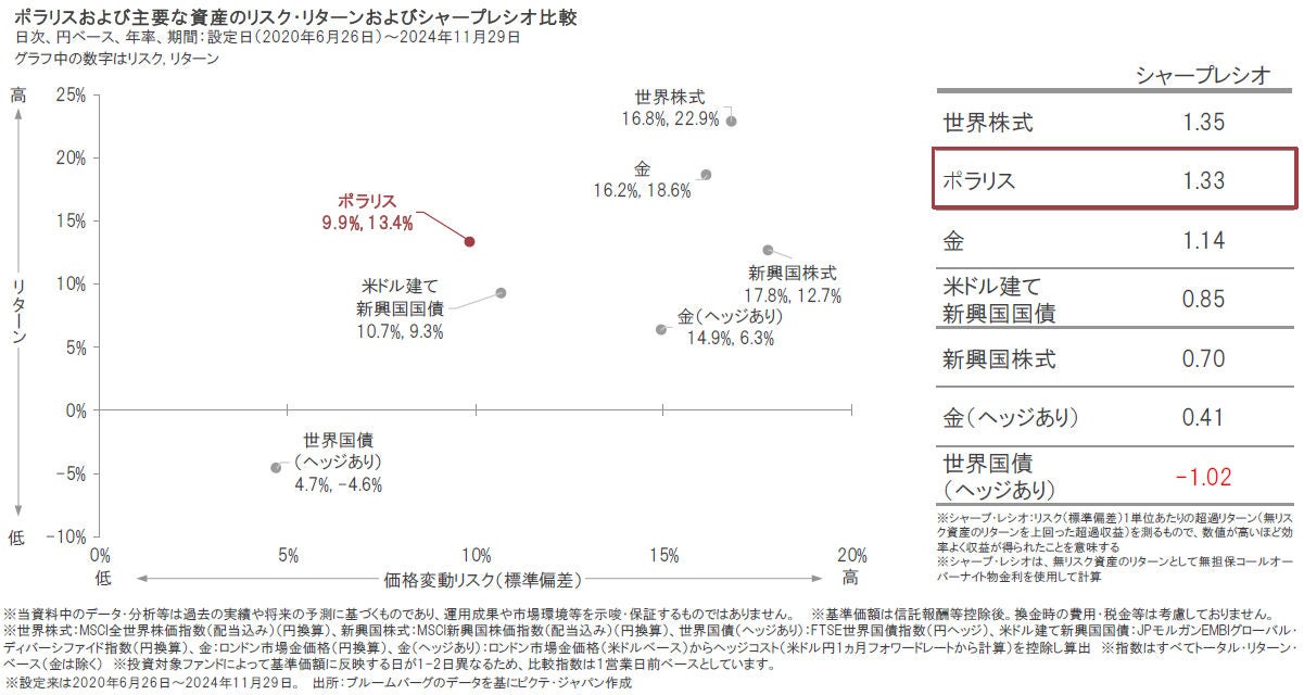 ポラリスの設定来の年率のリスク(標準偏差)とリターンはそれぞれ9.9%、13.4%となっています。