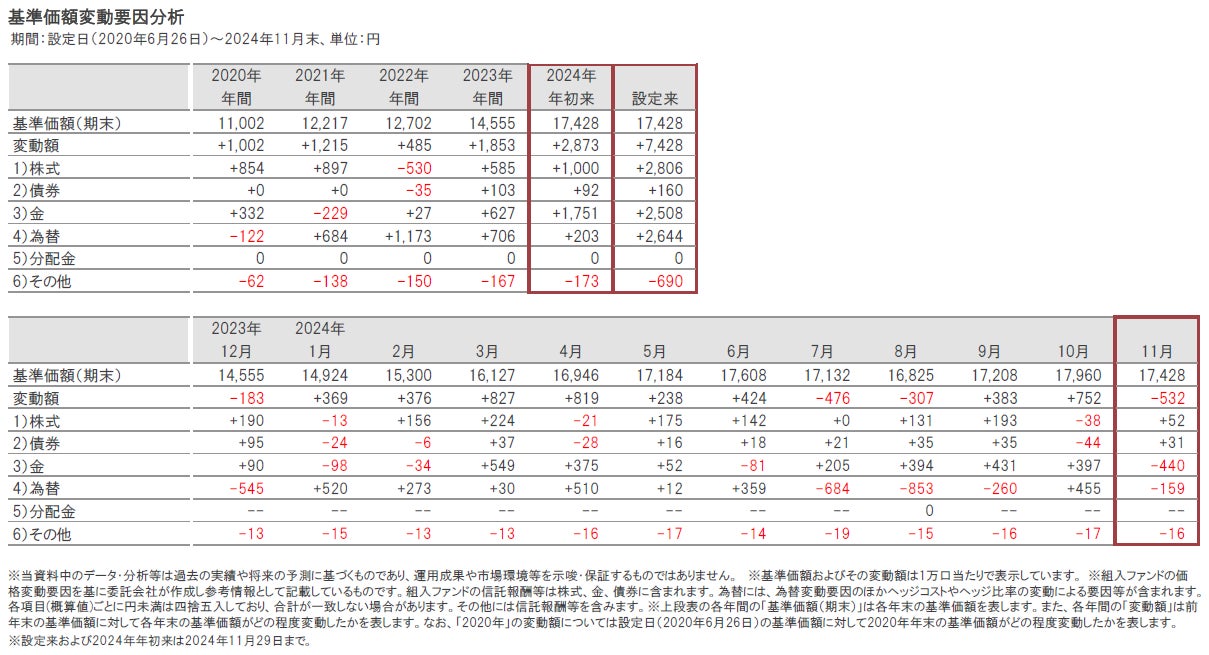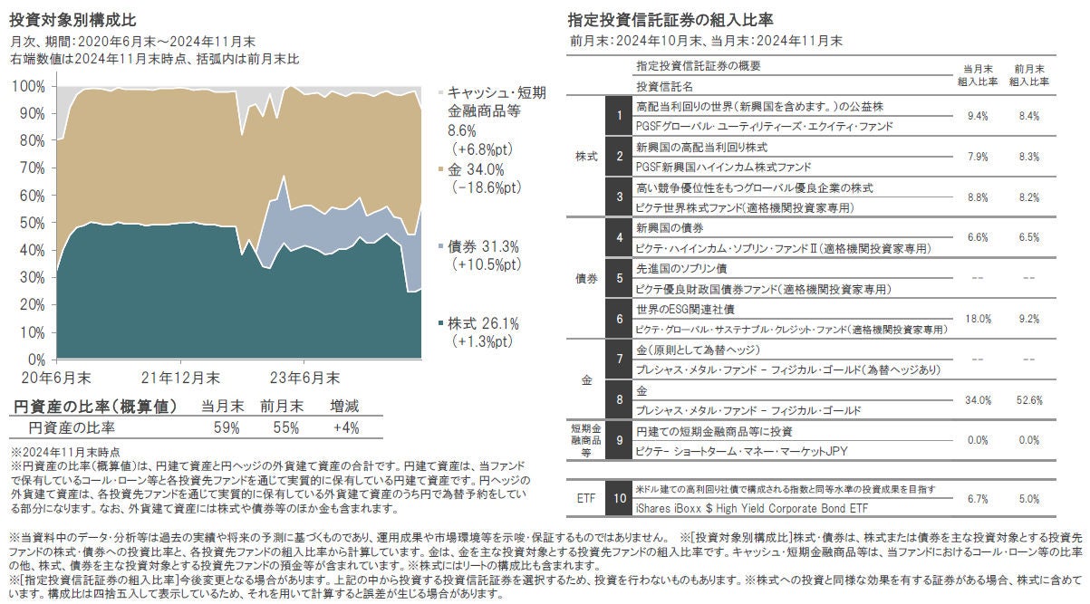 2024年11月末の組入比率は、前月末に対して、債券、キャッシュ等、株式を引き上げた一方、金を引き下げました。
