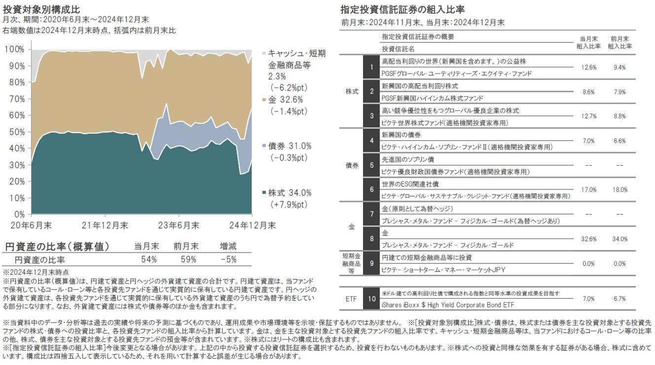 2024年12月末の組入比率は、前月末に対して、株式を引き上げた一方、キャッシュ等、金、債券を引き下げました。