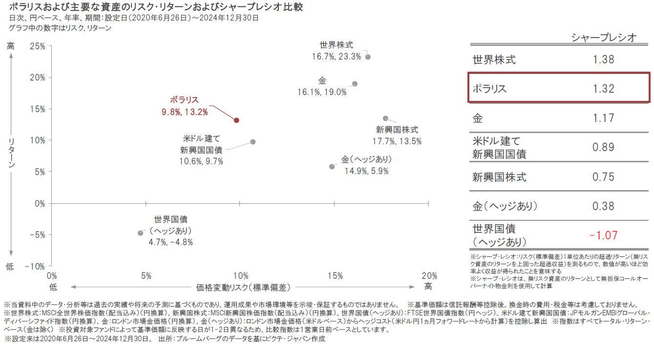 ポラリスの設定来の年率のリスク(標準偏差)とリターンはそれぞれ9.8%、13.2%となっています。