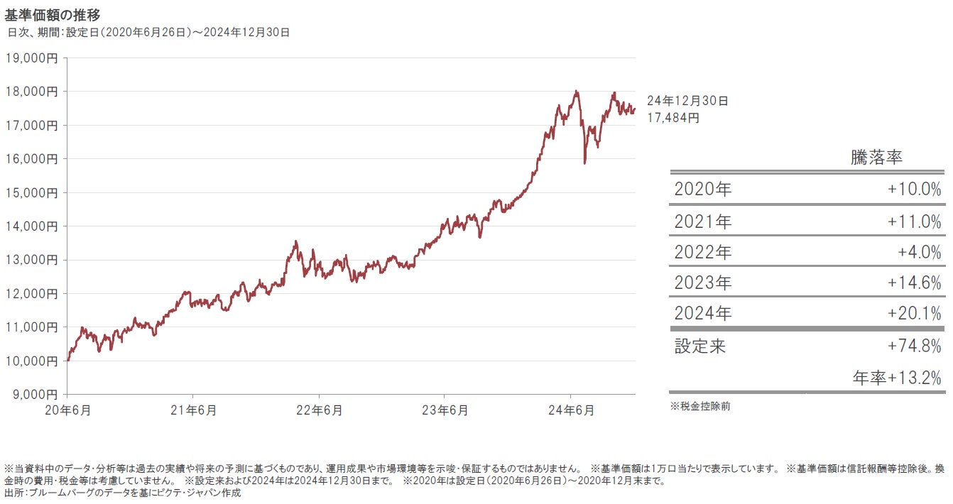 2024年12月30日のポラリスの基準価額は17,484円となり、設定来で+74.8%(年率+13.2%)、年間で+20.1%上昇しています。
