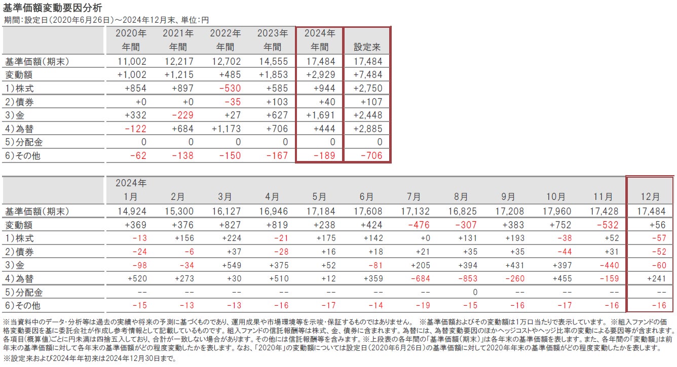 基準価額の変動要因の内訳は、1)~3)市場要因(価格、金利、信用力等の変化による株式、債券、金の変動要因)、4)為替要因、5)分配金要因、および、6)その他です。