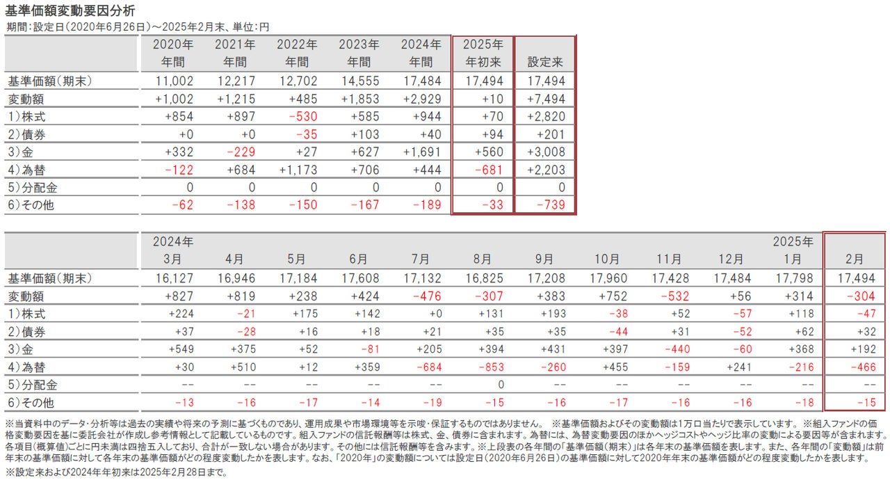 基準価額の変動要因の内訳は、1)~3)市場要因(価格、金利、信用力等の変化による株式、債券、金の変動要因)、4)為替要因、5)分配金要因、および、6)その他です。