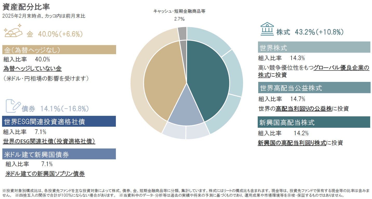 ポラリスは、株式、債券、金の組入比率の変更だけでなく、株式部分、債券部分それぞれが、特徴の異なる複数のファンドを投資対象としており、投資先ファンドの比率を変更することで、投資環境にあった細やかな運用を行っています。2025年2月は、株式、金の組入比率を引き上げ、債券、キャッシュ・短期金融商品等を引き下げました。