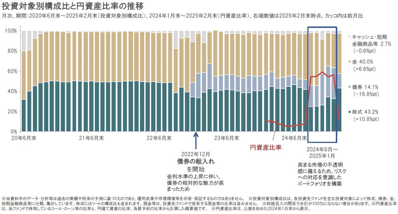 ポラリスでは、2025年2月末現在、株式と金を40%程度、債券を15%程度、組入れています。また円資産比率(円建て資産と円ヘッジの外貨建資産比率)は、2024年9月~2025年1月まで50%超としていましたが、2025年2月末時点では10%程度まで引き下げています。