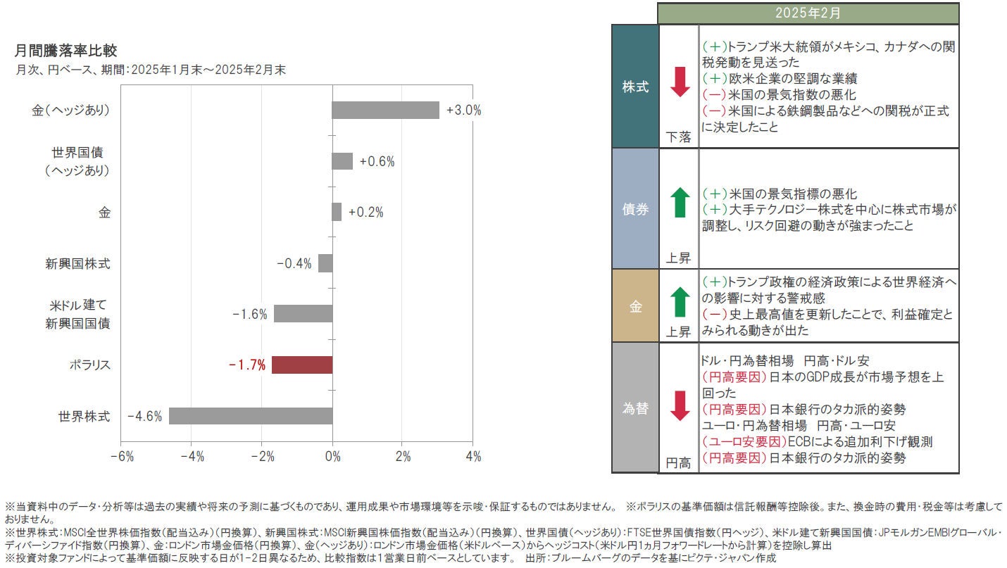 2025年2月は、世界株式が下落した一方、世界国債、金は上昇(現地通貨ベース)しました。また、為替はドルやユーロに対して円が上昇しました。