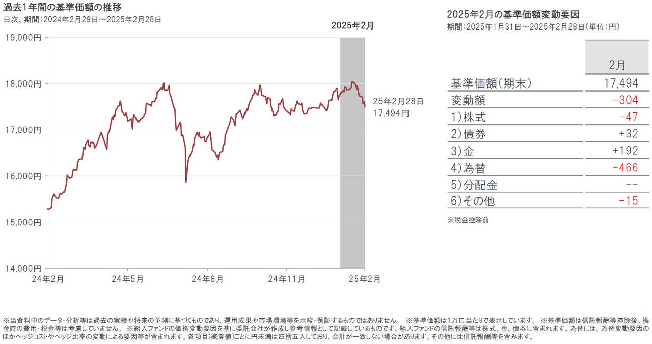 2025年2月28日のポラリスの基準価額は、前月末比304円下落(-1.7%)の17,494円となりました。