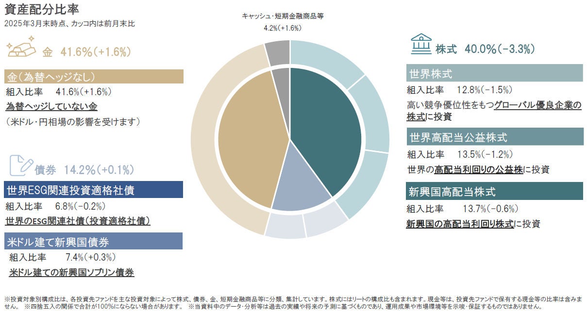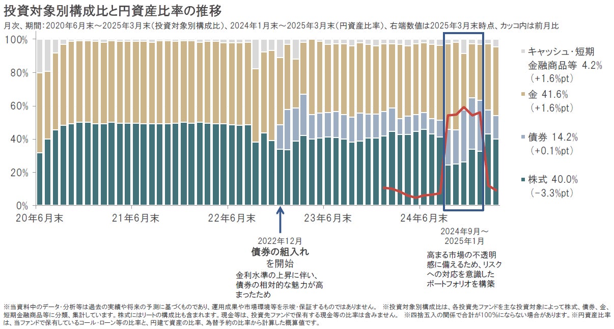 ポラリスでは、2025年3月末現在、株式と金を40%程度、債券を15%程度、組入れています。