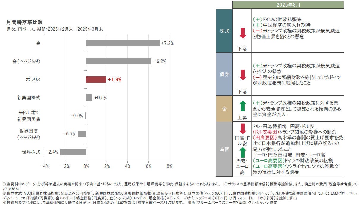 2025年3月は、世界株式、世界国債が下落した一方、金は大きく上昇(現地通貨ベース)しました。また、為替はドルに対して円が上昇した一方、ユーロに対しては円が下落しました。