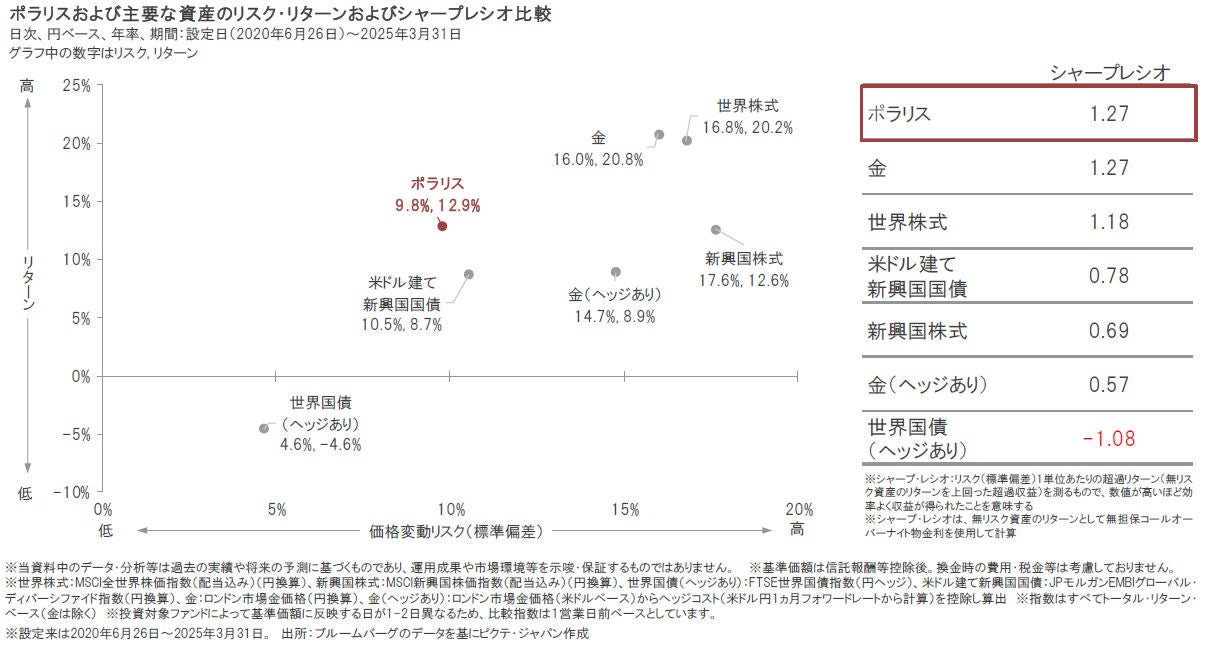 ポラリスの設定来の年率のリスク(標準偏差)とリターンはそれぞれ9.8%、12.9%となっています。