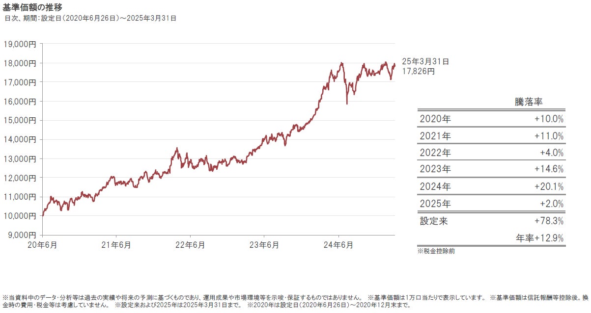 2025年3月31日のポラリスの基準価額は17,826円となり、設定来で+78.3%(年率+12.9%)上昇しています。