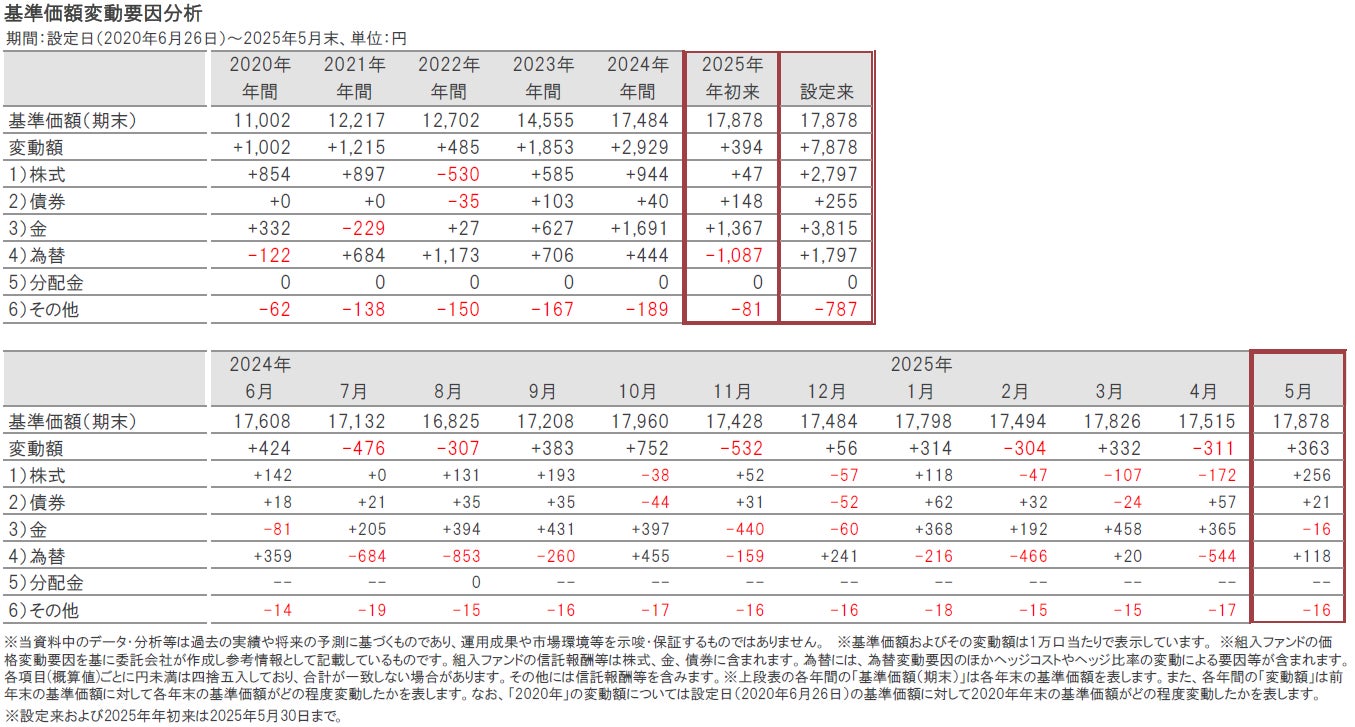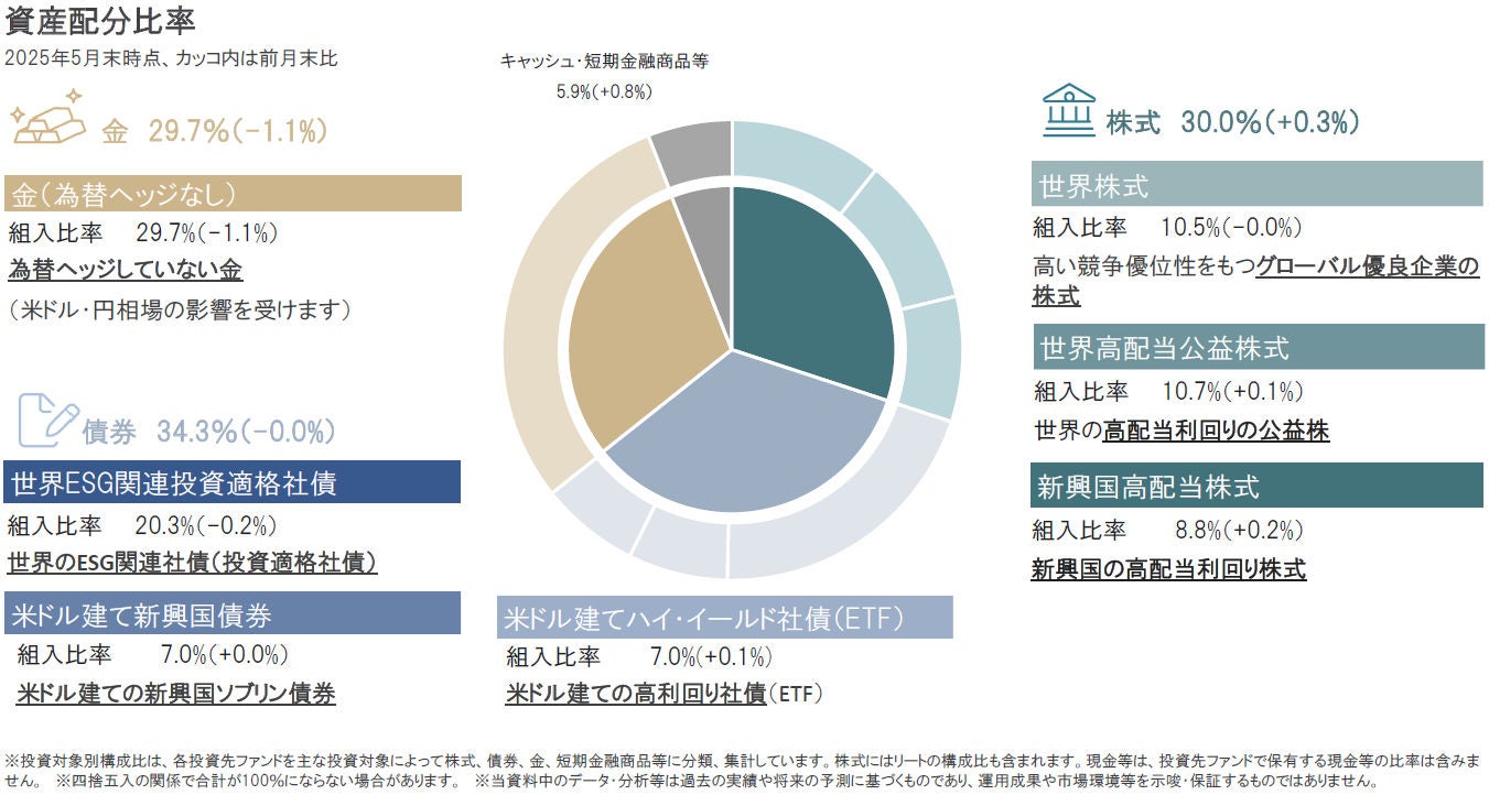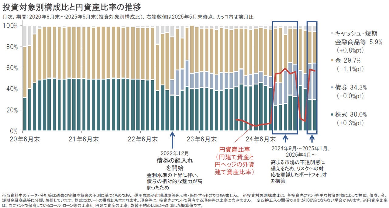 2025年5月は、株式、キャッシュ・短期金融商品等組入比率を引き上げ、金を引き下げましたが、全体的に小幅な変更にとどまりました。また円資産比率(円建て資産と円ヘッジの外貨建て資産比率)は2025年4月以降、60%近い水準で維持しています。