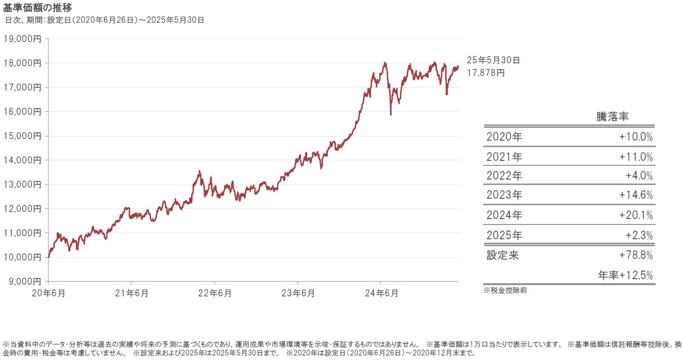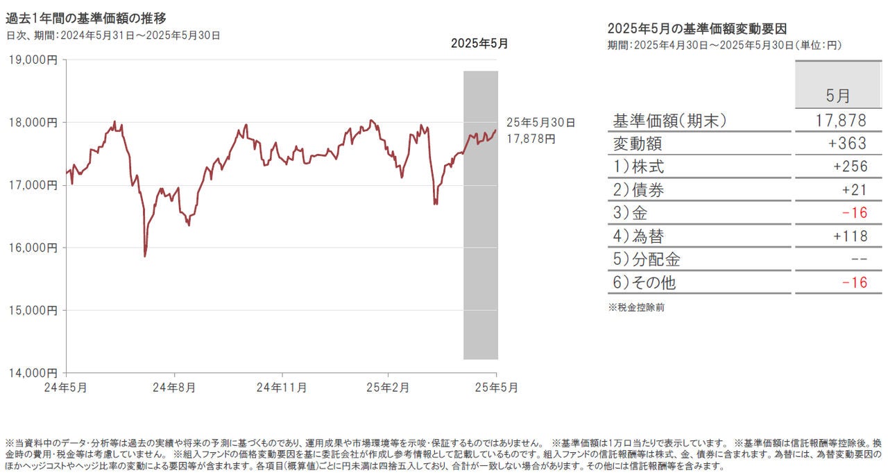 2025年5月30日のポラリスの基準価額は、前月末比363円上昇(+2.1%)の17,878円となりました。