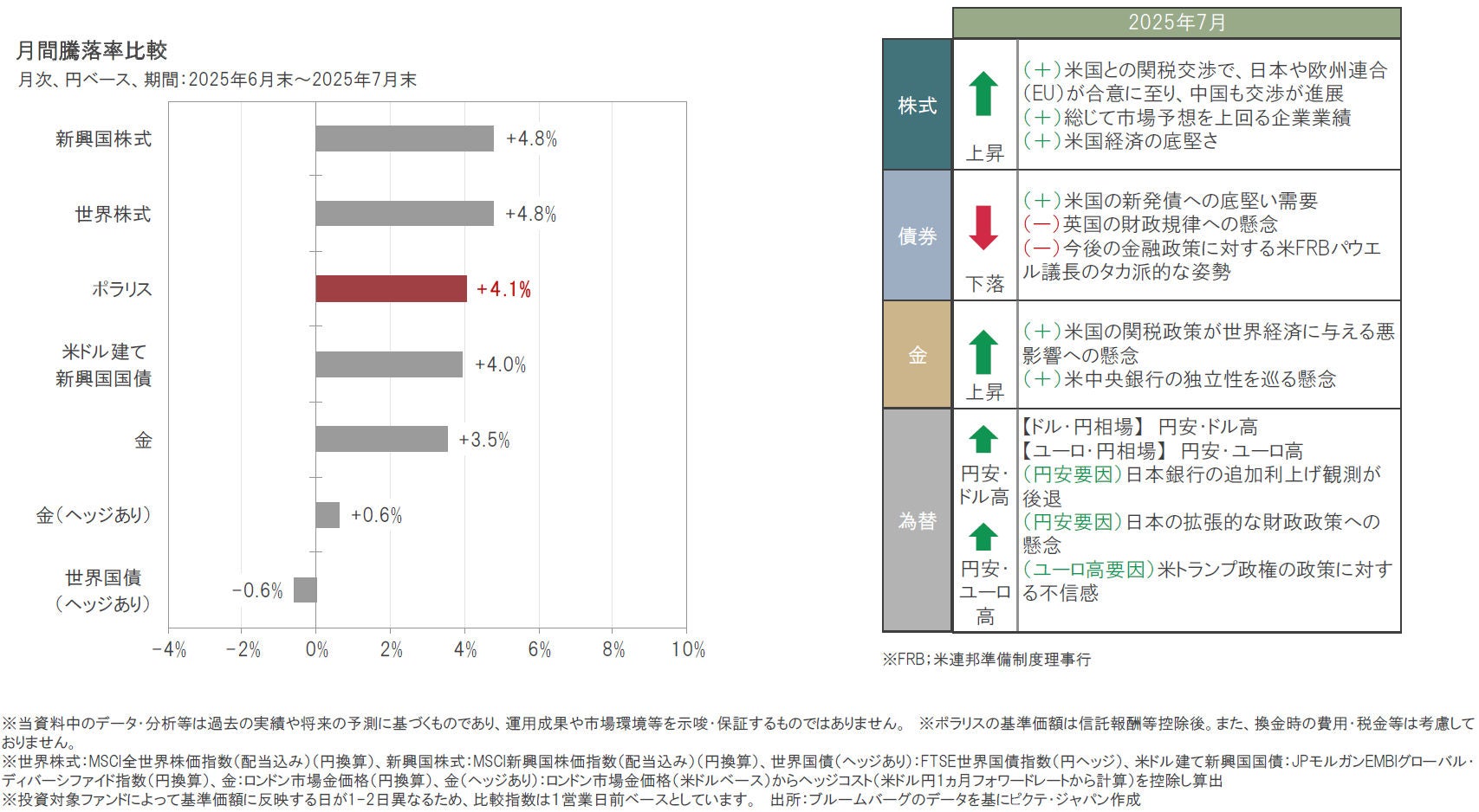 2025年7月は、現地通貨ベースでは世界株式、新興国株式、米ドル建て新興国国債、金などが上昇した一方、世界国債は下落しました。また為替は円が米ドルなどの通貨に対して下落しました。