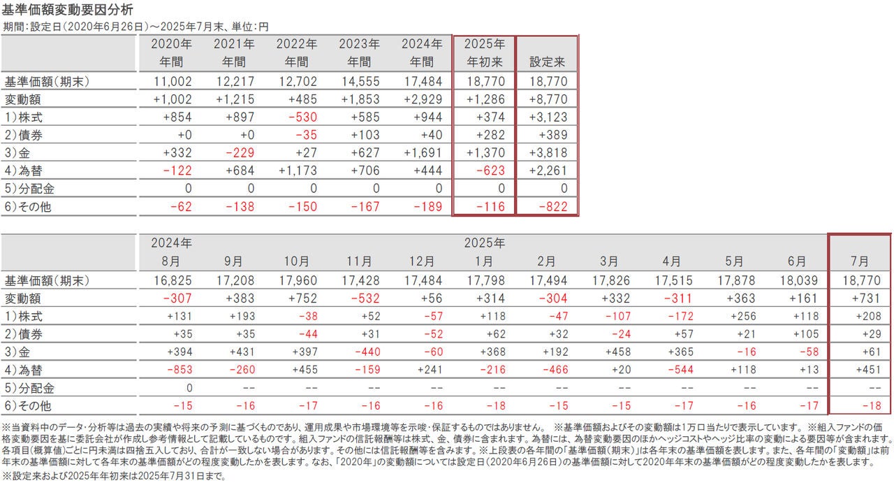 基準価額の変動要因の内訳は、1)~3)市場要因(価格、金利、信用力等の変化による株式、債券、金の変動要因)、4)為替要因、5)分配金要因、および、6)その他です。