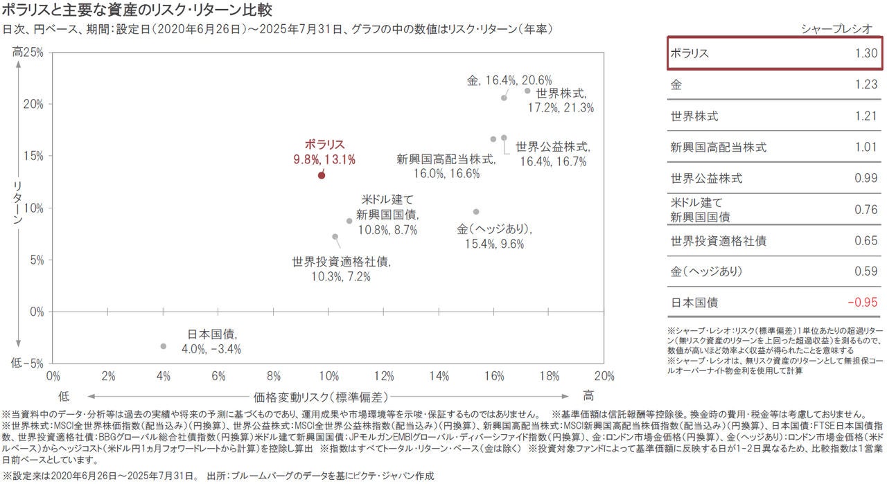 ポラリスの設定来の年率のリスク(標準偏差)とリターンはそれぞれ9.8%、13.1%となっています。