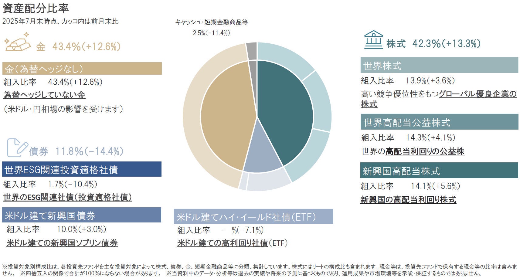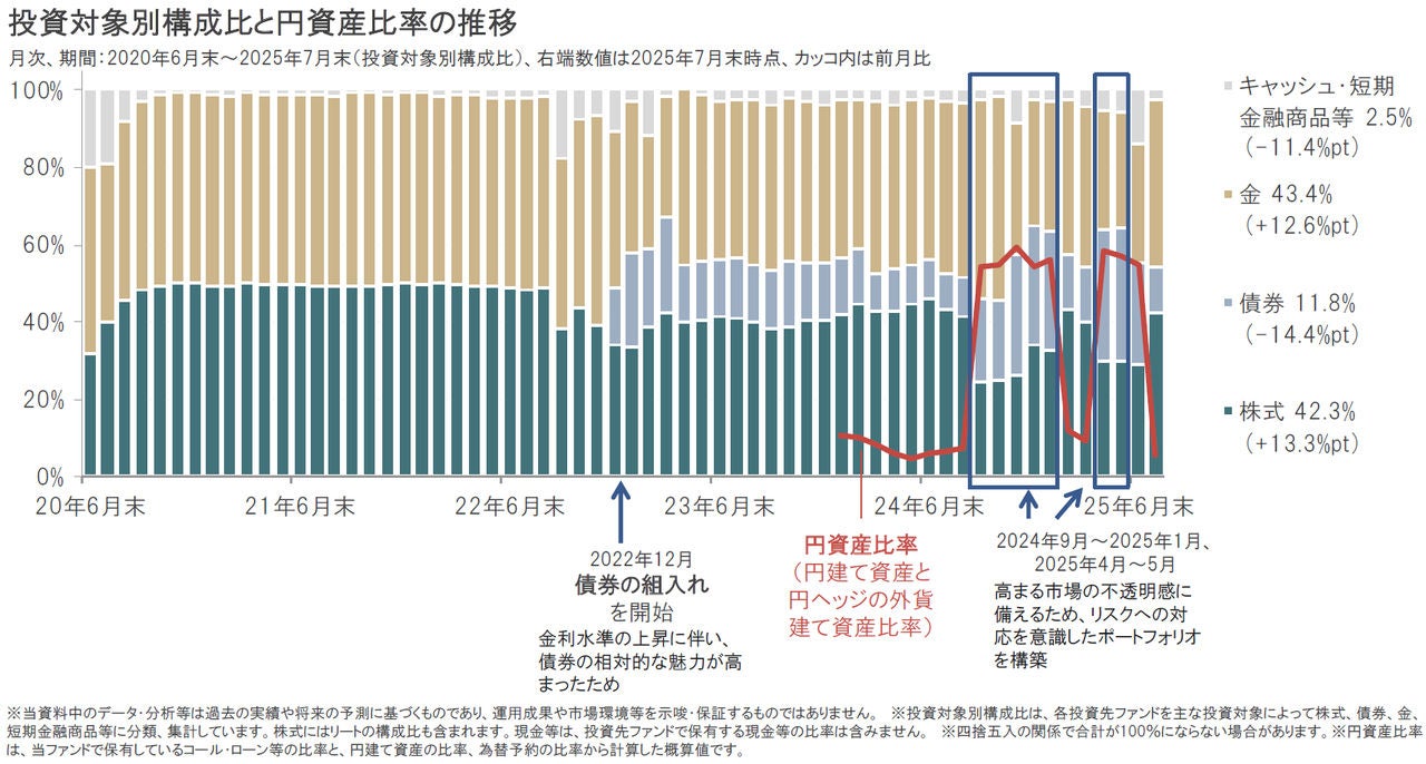 2025年7月は、米国の関税政策などを巡る不透明感の後退を受け、株価の上昇トレンドを意識したポートフォリオを構築する中で、株式、金の組入比率を引き上げ、債券、キャッシュ・短期金融商品等を引き下げました。また円資産比率(円建て資産と円ヘッジの外貨建て資産比率)は円安リスクに配慮し、2025年7月末時点で6%としており、6月末時点の50%超から大幅に引き下げました。