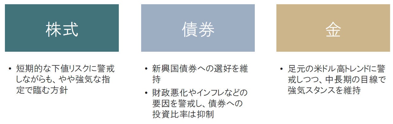 これらを鑑みて、株式に関しては短期的な下値リスクに警戒しながらも、やや強気な姿勢で臨む方針です。債券部分では新興国に対する選好を維持するものの、財政悪化やインフレといったリスク要因を警戒し、配分を抑えるスタンスです。為替については、主要通貨に対する相対的な円安リスクに配慮すべく円資産比率を引き下げています。金に関しては足元のドル高トレンドに警戒しつつ、中長期な目線での強気スタンスを維持する方針です。