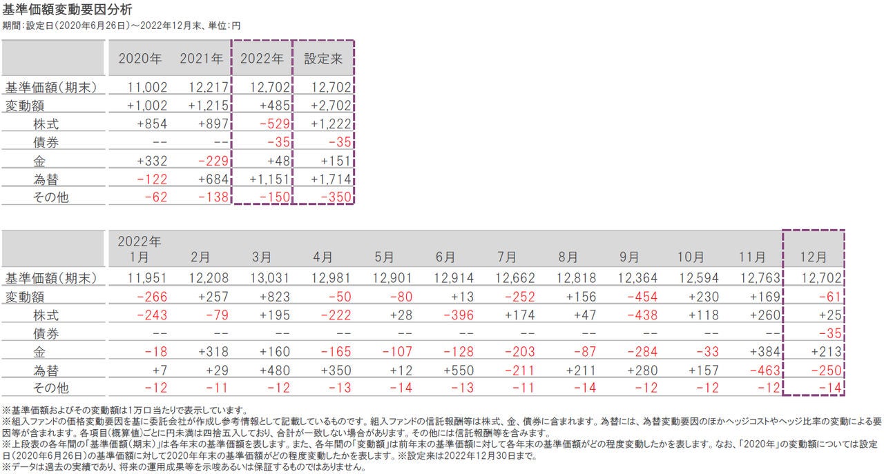 2022年12月は、株式と金がプラス寄与となりましたが、債券と為替がマイナス寄与となり、基準価額は下落しました。