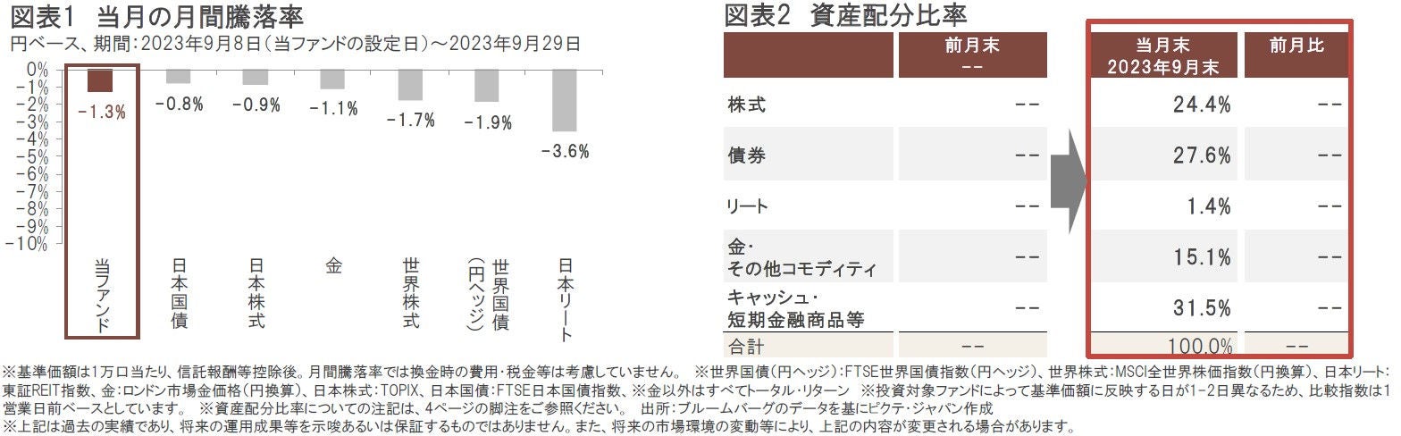 当月末の基準価額は9,872円、設定日(2023年9月8日)以降で-128円(-1.3%)となりました。株式、債券、金・その他コモディティ、リートすべてが基準価額にとってマイナス寄与となりました。