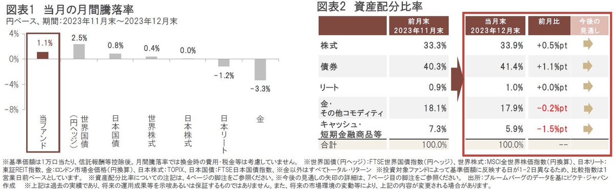 株式、債券がプラス寄与となった一方、金・その他コモディティ、リートはマイナス寄与となりました。