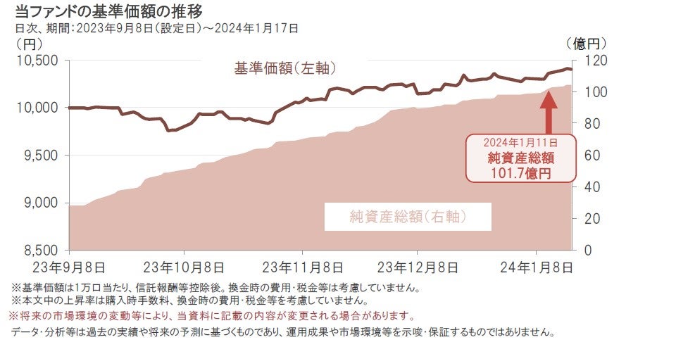 また、当ファンドの純資産総額は2024年1月11日に101.7億円となり、初めて100億円を超えました(1月17日時点では103.9億円)。