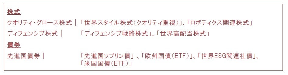 株式については、相対的に景気変動に左右されにくいと考えられるクオリティ・グロース株式やディフェンシブ株式を選好しています。債券については、全般に成長率低下が金利低下(債券価格は上昇)につながると見込んでいますが、デュレーションリスクはコントロールしつつ、組入比率の引き上げを検討していきます。なお、クレジット・リスクを避ける観点から先進国の国債と投資適格債券に注目しています。