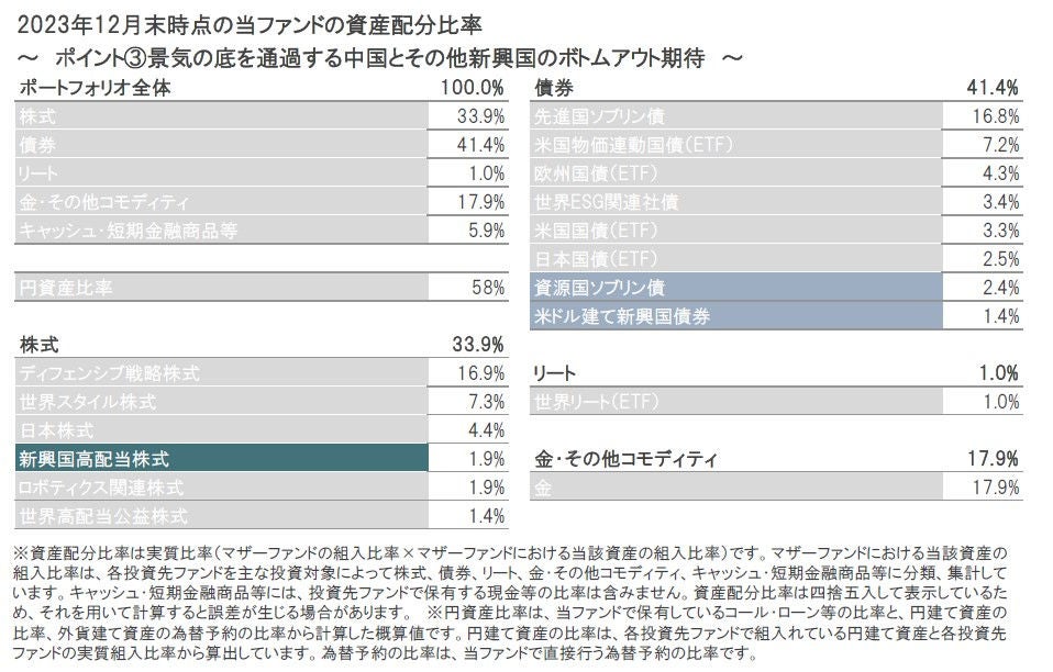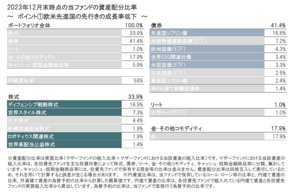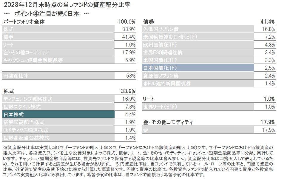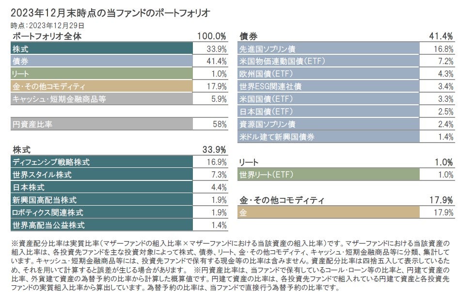 2023年12月末時点のポートフォリオの構成比は、株式33.9%、債券41.4%、リート1.0%、金・その他コモディティ17.9%、キャッシュ・短期金融商品等5.9%となっています。
