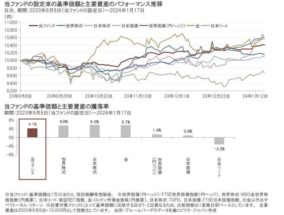 当ファンドの基準価額は、設定日(2023年9月8日)から足元(2024年1月17日)までで、+4.1%となりました。一方、同期間における主要資産の騰落率をみると、世界株式(円換算)が+6.0%、日本株式が+6.0%、金(円換算)が+5.7%、世界国債(円ヘッジ)が+1.4%、日本国債が+0.9%、日本リートが-3.2%などとなりました。