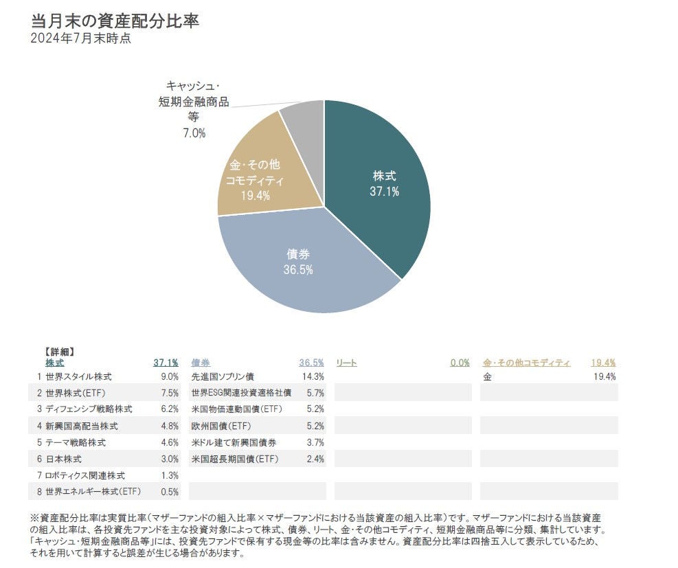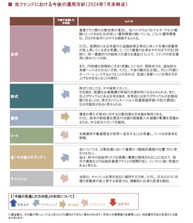当ファンドの運用チームでは、株式と債券の分散効果が復活し、当ファンドのようなマルチ・アセット戦略にとっておおむね好ましい運用環境は、今後も継続するとの見方を変えていません(2ページ目の「当ファンドにおける今後の運用方針(2024年7月末時点)」も併せてご参照ください)。