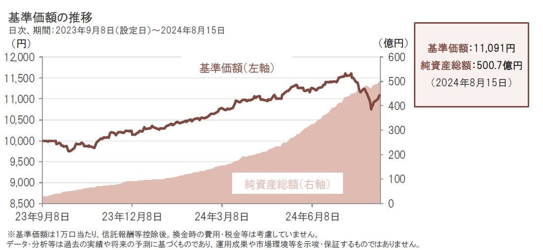 ●足元で世界的な金融市場の変動の影響を受けながらも、当ファンドの基準価額は2023年9月8日の運用開始以降、底堅く推移しています。純資産総額は2024年8月15日に初めて500億円を超えました。