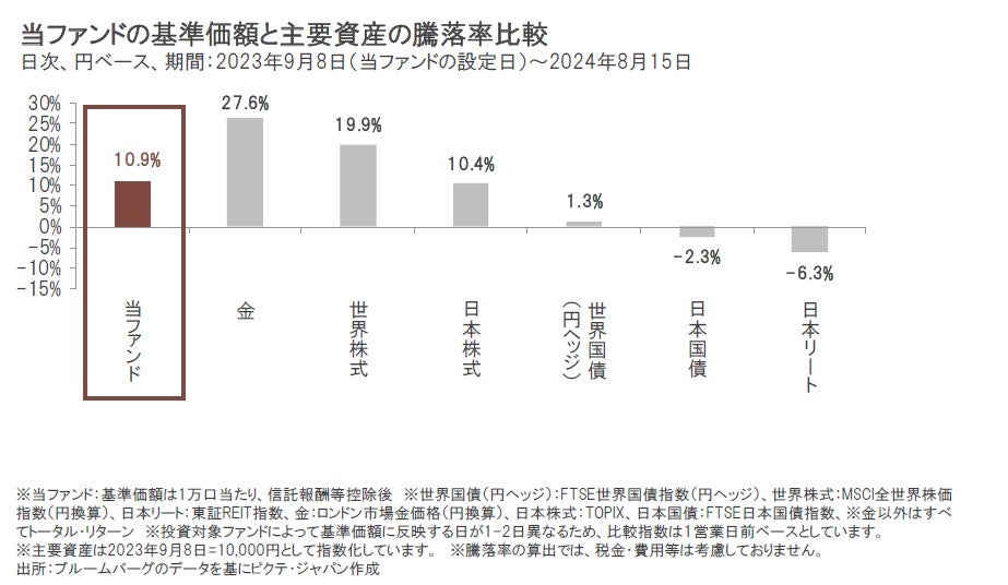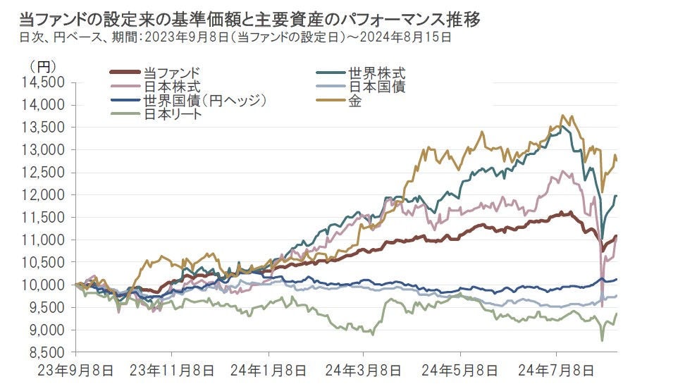 2024年7月半ば以降の世界的な金融市場の変動からマイナスの影響を受けながらも、2023年9月8日に運用を開始したピクテ・プレミアム・アセット・アロケーション・ファンド(以下、当ファンド)の基準価額は、底堅く推移しています。2024年8月15日の当ファンドの基準価額は11,091円、設定来で+10.9%の上昇となりました。