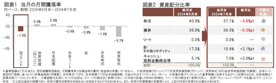 当月は主に、株式の組入比率を引き下げ、金・その他コモディティの組入比率およびキャッシュ比率を引き上げました。株式では、ディフェンシブ戦略株式や世界スタイル株式(クオリティ重視)、世界エネルギー株式(ETF)などの組入比率を引き下げました。債券では、組入比率の大きな変更はありませんでした。金・その他コモディティでは、金の組入比率を引き上げました。
