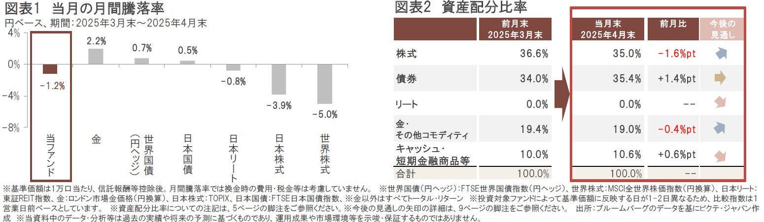 株式と債券がマイナス寄与となった一方、金・その他コモディティはプラス寄与となりました。なお、円高によるマイナス分の一部は、為替ヘッジで相殺されました。