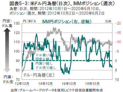 ただし、足元ではドル売り・円買いのボジションが積みあがり(図表5-3参照)、決済通貨としてのドル需要逼迫とのバランスから、短期的にはドルはこのボジションが解消するまでは底固いと見ています。 (図表5-1~5-3参照)