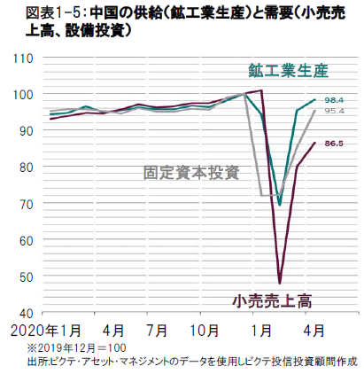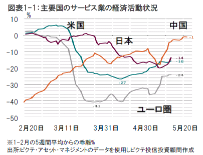 ピクテの景気循環指標は、世界経済が、総じて、最悪期を脱しつつあることを示唆しています。毎日の様々な活動を計測するアップルやグーグルの「デイリー・アクティビティ・トラッカー」は、先進国の多くが、3月あるいは4月の活動量の減少分を半減し、徐々に、正常化に向かいつつあることを示しています。新型コロナウイルス発生前の水準を、ユーロ圏は24%強、日本と米国は15%程度、下回っているのに対し、中国は1月の水準を回復していますが、ロックダウンについても景気対策についても、独自の政策を講じている国のことですから、他国が参考にするのは適切ではないかもしれません。(図表1-1参照)