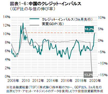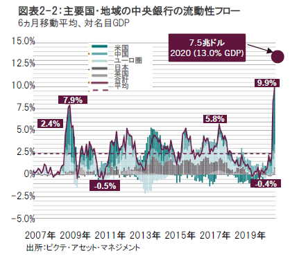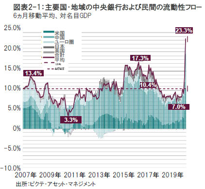 ピクテの流動性指標は、リスク性資産に極めて強気です。史上最大の紙幣発行(資金供給)と、発行された紙幣を、2008年~2009年の金融危機時とは異なって、信用創造を通じて市中に流通させることが出来るほど銀行のバランスシートが堅固だからです。公共部門および民間部門の流動性創出は、世界のGDPの23%に相当し(図表2-1参照) 、2016年に記録した前回のピーク時の17%を上回るります。2020年の中央銀行が供給する流動性は年間およそ13% (図表2-2参照)と2009年のおよそ8%を上回ると予想されます。もっとも、通貨創造の勢い(モメンタム)はピークを打ちつつあるように思われます。
