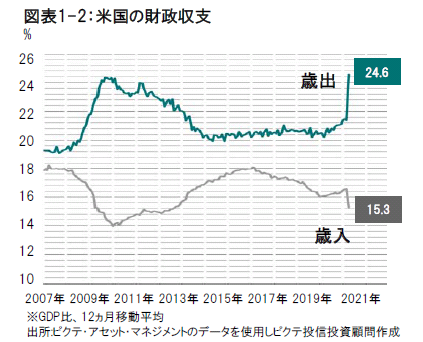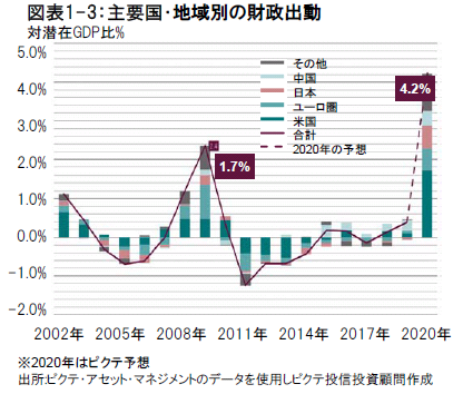 米国では失業者の急増が消費を直撃しており、ピクテでは、個人消費の山から谷への下げが12%に達すると見ていますが、巨額の財政刺激が影響を和らげると考えます。米国の財政赤字は高水準に膨れ上がっており、今後下院での討議が予定される各種の追加支援策を除いても、GDP(国内総生産)比20%強の4兆ドルに達することが予想されます(図表1-2参照)。追加資金の90%強は、米連邦準備制度(FE)が供給します。