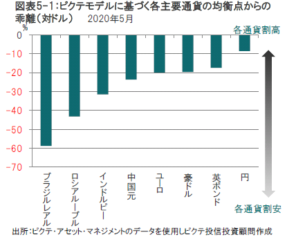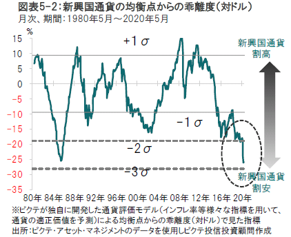 新興国通貨は、景気先行指数は新興国のほうが先進国よりも状態が良く、バリュエーションの観点からも魅力的です。ピクテのバリュエーション指標は、新興国通貨が購買力平価ベースで20数年ぶりの割安水準にあることを示唆しています。