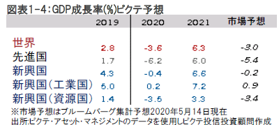 一方、ユーロ圏は、これまでのところ、米国に比べて慎重な対応に終始してきましたが、共通債の発行を通じて資金を調達し、(補助金と融資を組み合わせて)7,500億ユーロの復興基金を新たに創設するとの提案がなされたことは域内の財政統合に向けた大きな一歩だと考えます。当基金は、とりわけ危機発生直後の加盟国間の団結に欠けた行動を勘案すると、短期の救済策よりも遥かに重要な施策となる可能性があり、ユーロ圏にとっての大きな進展を意味します。恐らくそうなることが想定されますが、復興基金設立案が骨抜きにされたとしても、独仏両国が主導する基金の創設は、域内の中・長期の経済見通しを変える可能性があると考えます。中国とインドが支える新興国経済の落ち込みは、先進国よりも軽度に留まると見られますが、今年の世界経済は3.6%のマイナス成長が予想され、山から谷への下落は7.4%と(2008年の)グローバル金融危機の2倍に達することが想定されます(図表1-4参照)。