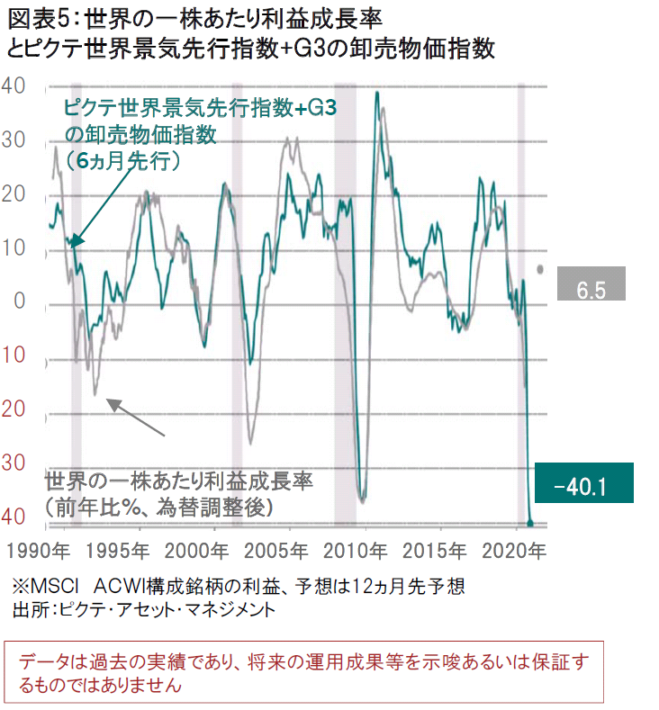バリュエーション(投資価値評価)は、株価がじり高となるなかで割安感が薄れています。その反面、ピクテの世界株式の利益成長率のトップダウン予想モデルは、向こう12ヵ月先の世界の一株当たり利益が約4割の減益にまで落ち込むと示唆しており、ボトムアップの市場予想+6.5%と大きく乖離しています(図表5参照)。現時点でどちらが正しいかを予見することは時期尚早ですが、業績の下方修正リスクが株価の重石になる可能性があります。