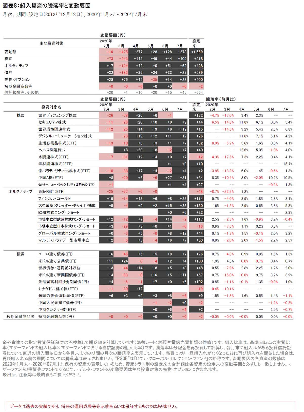 一方、大きなマイナス要因となったのは、米ドル建て新興国債券(円)などでした。利回り面での魅力や為替の割安感から注目していましたが、コロナショック時には下落を余儀なくされました。 (4頁図表7、5頁図表8参照)