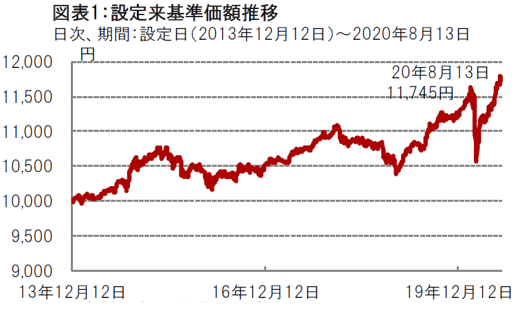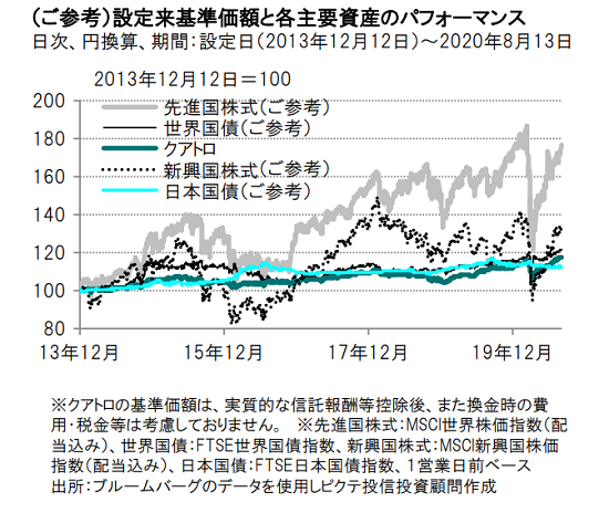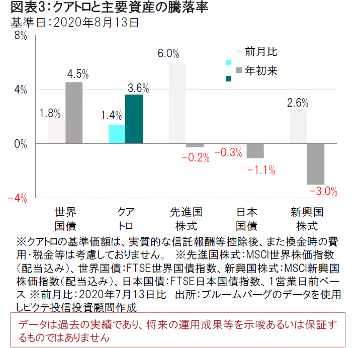 クアトロの基準価額は、コロナショックによる金融市場急落の影響で2020年3月に大きく下落した後回復し、2020年7月14日には高値を更新、8月13日現在で年初来で+408円(+3.6%)の11,745円となり、堅調に推移しています。(図表1~3参照)